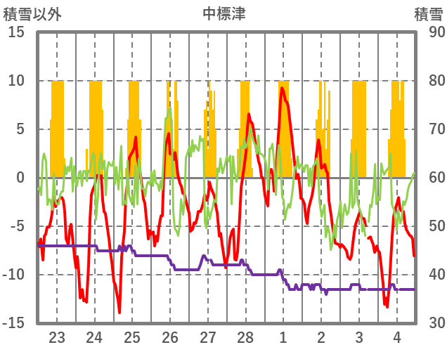 | 日 | 時 | 気温 | 降水 | 風向/風速 | 日照 | 積雪 | 降雪 |