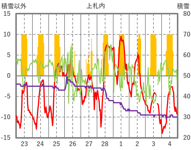 | 日 | 時 | 気温 | 降水 | 風向/風速 | 日照 | 積雪 | 降雪 |