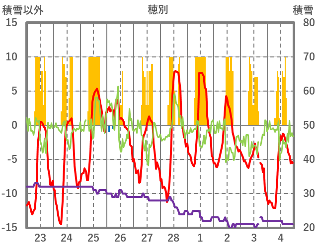 | 日 | 時 | 気温 | 降水 | 風向/風速 | 日照 | 積雪 | 降雪 |