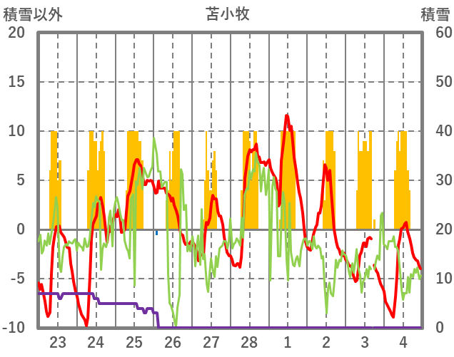 | 日 | 時 | 気温 | 降水 | 風向/風速 | 日照 | 積雪 | 降雪 |