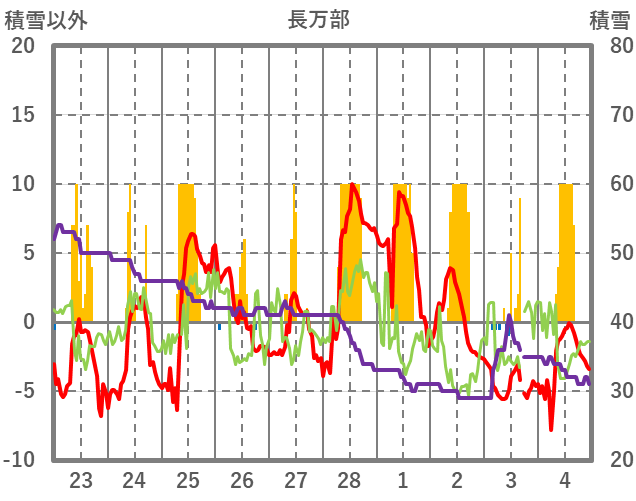 | 日 | 時 | 気温 | 降水 | 風向/風速 | 日照 | 積雪 | 降雪 |