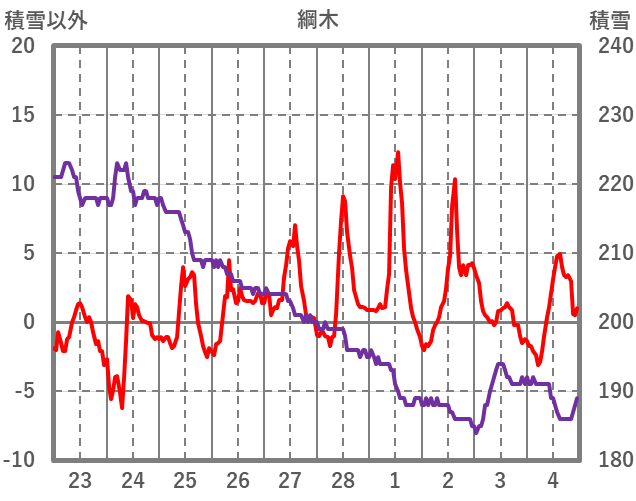| 日 | 時 | 気温 | 降水 | 風向/風速 | 日照 | 積雪 | 降雪 |