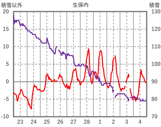 | 日 | 時 | 気温 | 降水 | 風向/風速 | 日照 | 積雪 | 降雪 |