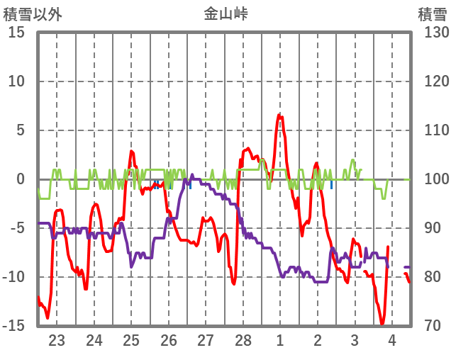 | 日 | 時 | 気温 | 降水 | 風向/風速 | 日照 | 積雪 | 降雪 |