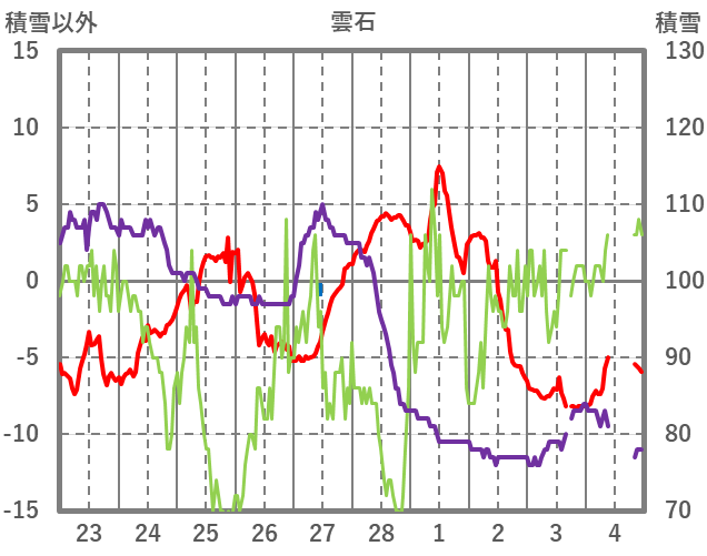 | 日 | 時 | 気温 | 降水 | 風向/風速 | 日照 | 積雪 | 降雪 |