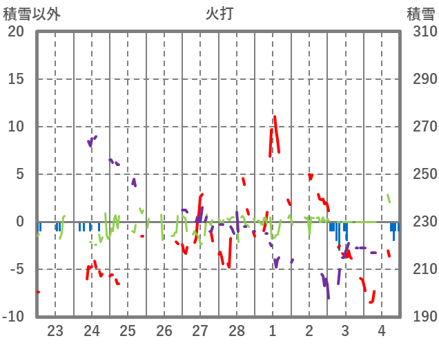 | 日 | 時 | 気温 | 降水 | 風向/風速 | 日照 | 積雪 | 降雪 |