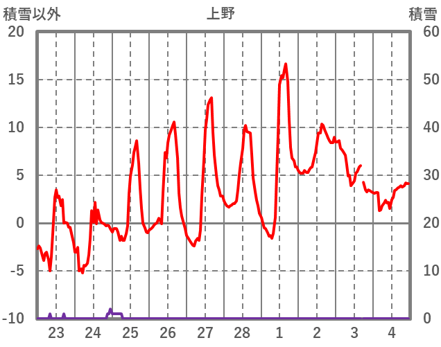 | 日 | 時 | 気温 | 降水 | 風向/風速 | 日照 | 積雪 | 降雪 |