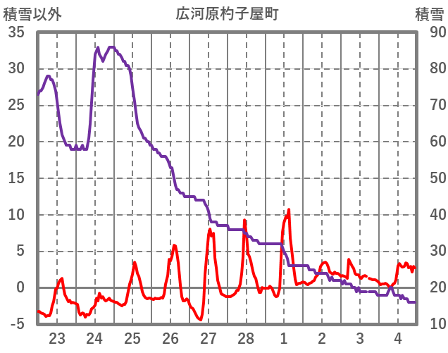 | 日 | 時 | 気温 | 降水 | 風向/風速 | 日照 | 積雪 | 降雪 |