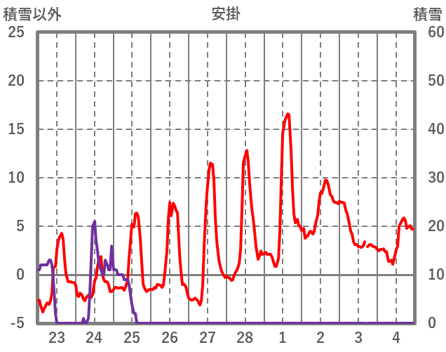 | 日 | 時 | 気温 | 降水 | 風向/風速 | 日照 | 積雪 | 降雪 |