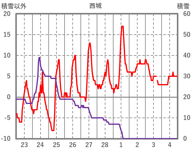 | 日 | 時 | 気温 | 降水 | 風向/風速 | 日照 | 積雪 | 降雪 |
