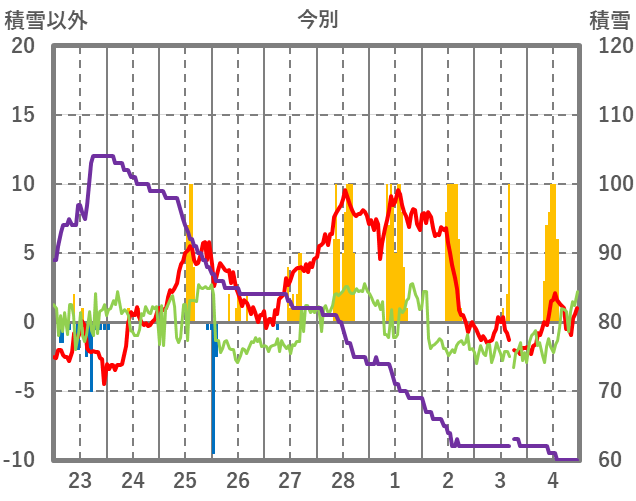 | 日 | 時 | 気温 | 降水 | 風向/風速 | 日照 | 積雪 | 降雪 |