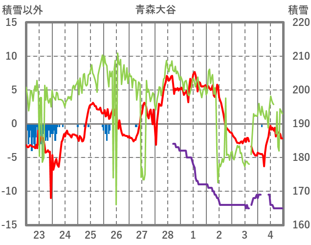| 日 | 時 | 気温 | 降水 | 風向/風速 | 日照 | 積雪 | 降雪 |