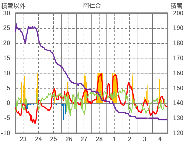 | 日 | 時 | 気温 | 降水 | 風向/風速 | 日照 | 積雪 | 降雪 |