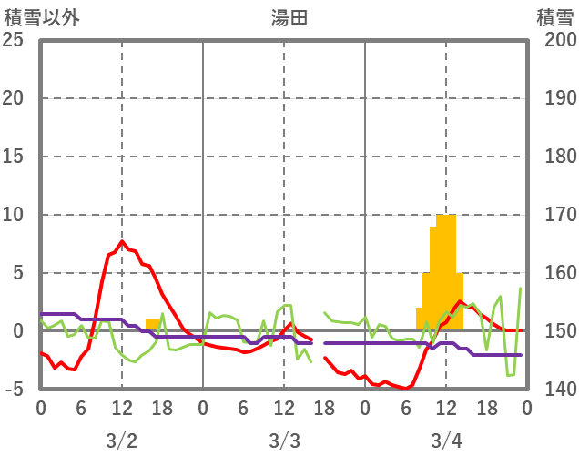 | 日 | 時 | 気温 | 降水 | 風向/風速 | 日照 | 積雪 | 降雪 |