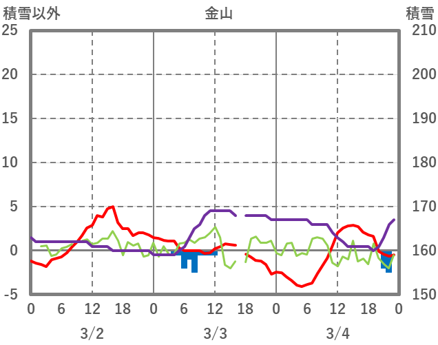 | 日 | 時 | 気温 | 降水 | 風向/風速 | 日照 | 積雪 | 降雪 |