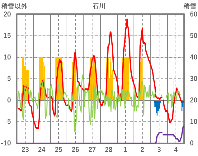 | 日 | 時 | 気温 | 降水 | 風向/風速 | 日照 | 積雪 | 降雪 |