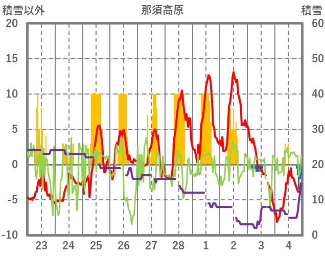 | 日 | 時 | 気温 | 降水 | 風向/風速 | 日照 | 積雪 | 降雪 |