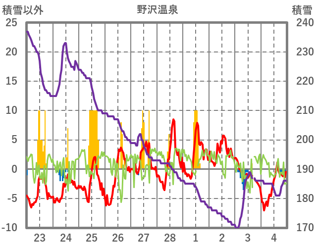 | 日 | 時 | 気温 | 降水 | 風向/風速 | 日照 | 積雪 | 降雪 |