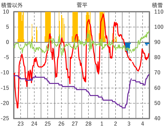 | 日 | 時 | 気温 | 降水 | 風向/風速 | 日照 | 積雪 | 降雪 |