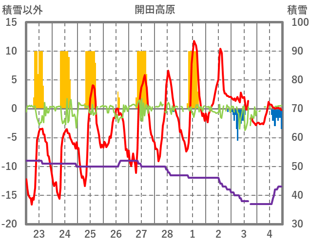 | 日 | 時 | 気温 | 降水 | 風向/風速 | 日照 | 積雪 | 降雪 |
