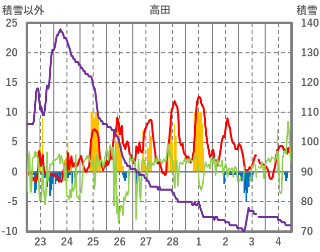 | 日 | 時 | 気温 | 降水 | 風向/風速 | 日照 | 積雪 | 降雪 |