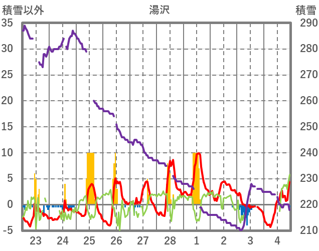 | 日 | 時 | 気温 | 降水 | 風向/風速 | 日照 | 積雪 | 降雪 |