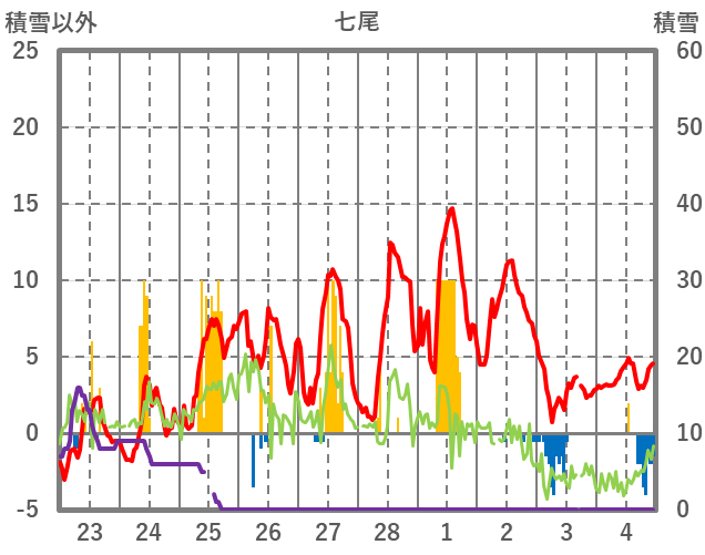 | 日 | 時 | 気温 | 降水 | 風向/風速 | 日照 | 積雪 | 降雪 |