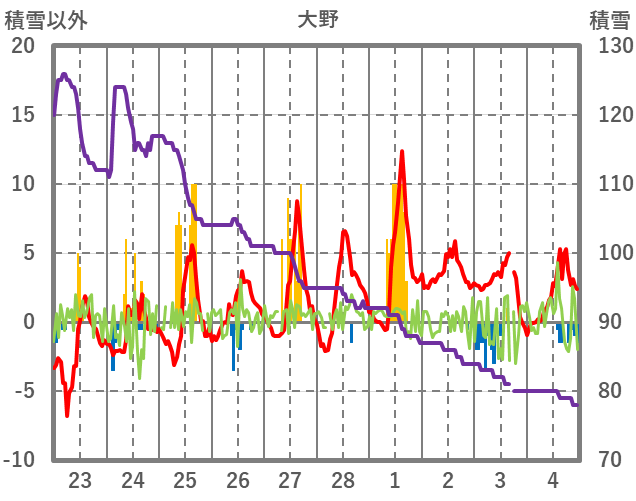 | 日 | 時 | 気温 | 降水 | 風向/風速 | 日照 | 積雪 | 降雪 |