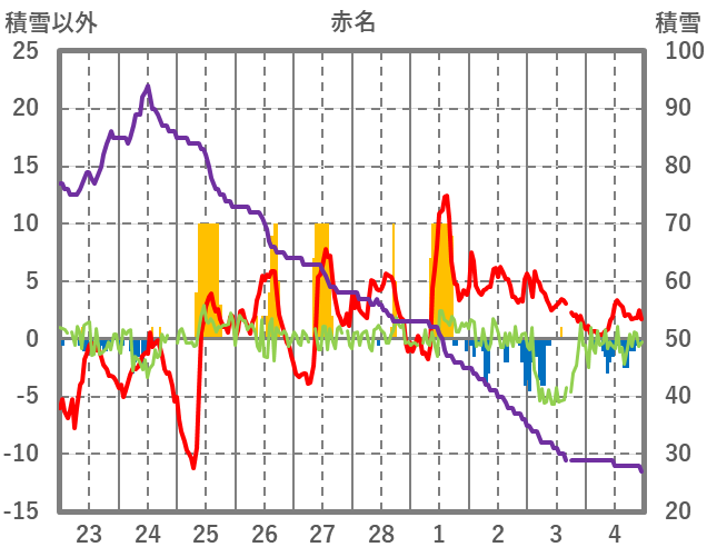 | 日 | 時 | 気温 | 降水 | 風向/風速 | 日照 | 積雪 | 降雪 |