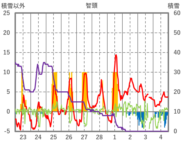 | 日 | 時 | 気温 | 降水 | 風向/風速 | 日照 | 積雪 | 降雪 |