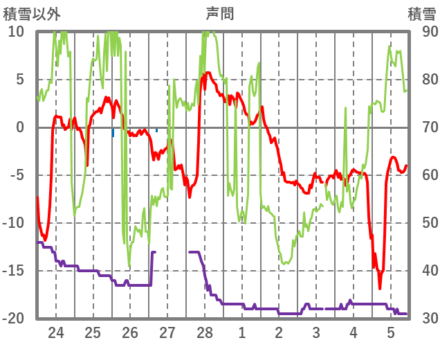 | 日 | 時 | 気温 | 降水 | 風向/風速 | 日照 | 積雪 | 降雪 |