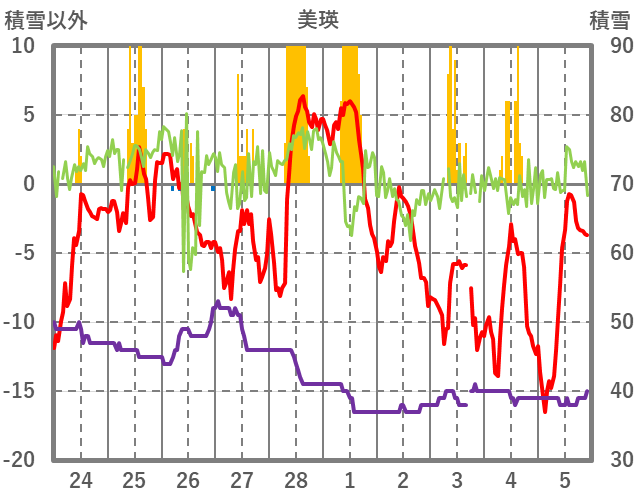 | 日 | 時 | 気温 | 降水 | 風向/風速 | 日照 | 積雪 | 降雪 |