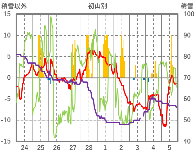 | 日 | 時 | 気温 | 降水 | 風向/風速 | 日照 | 積雪 | 降雪 |