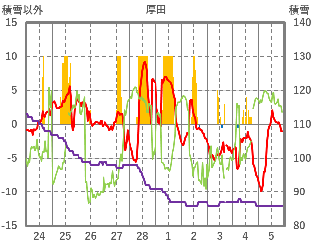 | 日 | 時 | 気温 | 降水 | 風向/風速 | 日照 | 積雪 | 降雪 |