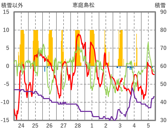 | 日 | 時 | 気温 | 降水 | 風向/風速 | 日照 | 積雪 | 降雪 |