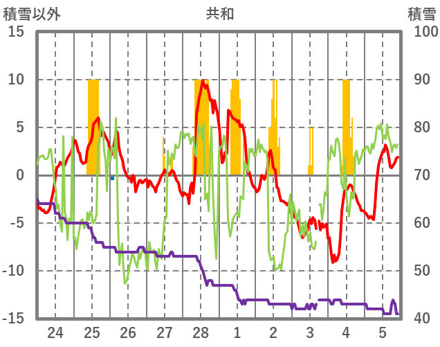 | 日 | 時 | 気温 | 降水 | 風向/風速 | 日照 | 積雪 | 降雪 |