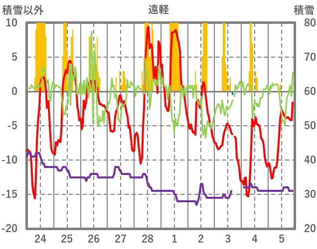 | 日 | 時 | 気温 | 降水 | 風向/風速 | 日照 | 積雪 | 降雪 |