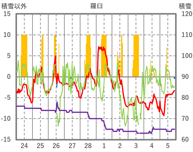 | 日 | 時 | 気温 | 降水 | 風向/風速 | 日照 | 積雪 | 降雪 |