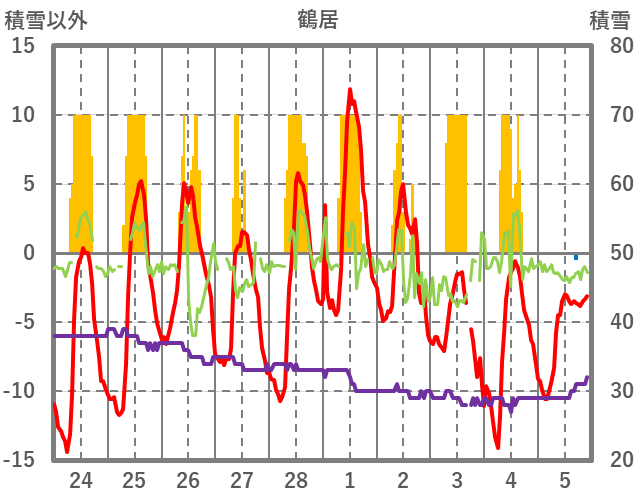 | 日 | 時 | 気温 | 降水 | 風向/風速 | 日照 | 積雪 | 降雪 |