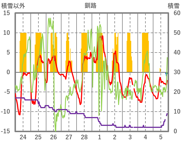 | 日 | 時 | 気温 | 降水 | 風向/風速 | 日照 | 積雪 | 降雪 |