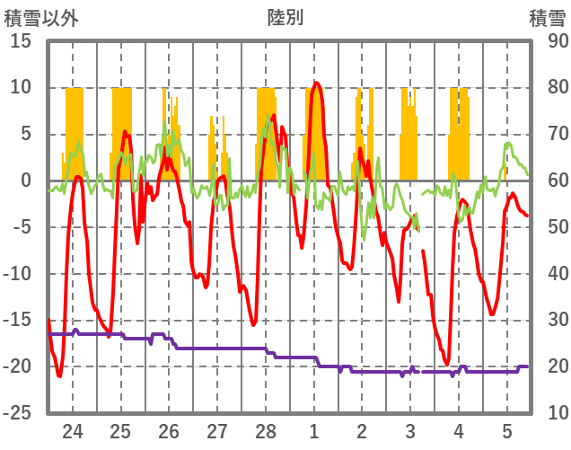 | 日 | 時 | 気温 | 降水 | 風向/風速 | 日照 | 積雪 | 降雪 |