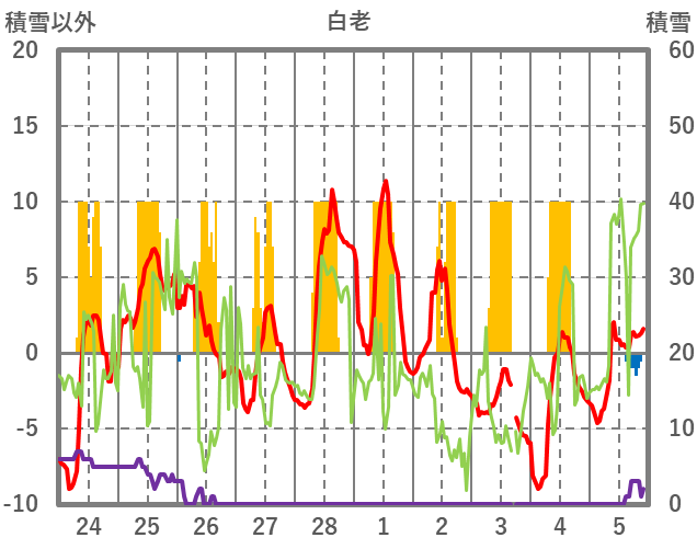 | 日 | 時 | 気温 | 降水 | 風向/風速 | 日照 | 積雪 | 降雪 |