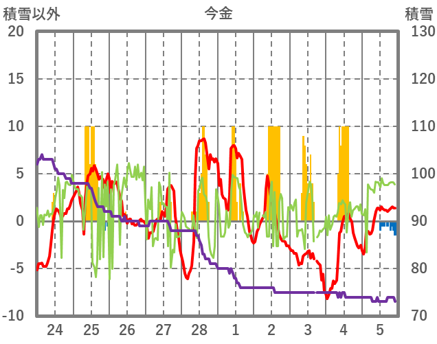 | 日 | 時 | 気温 | 降水 | 風向/風速 | 日照 | 積雪 | 降雪 |
