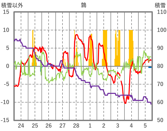 | 日 | 時 | 気温 | 降水 | 風向/風速 | 日照 | 積雪 | 降雪 |