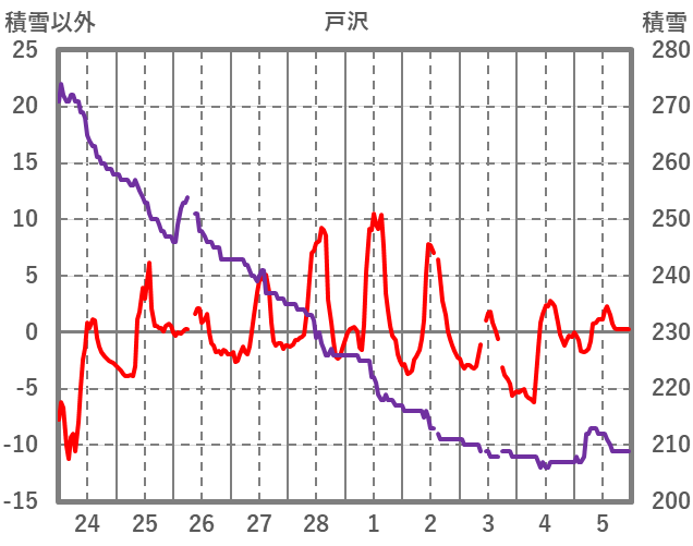| 日 | 時 | 気温 | 降水 | 風向/風速 | 日照 | 積雪 | 降雪 |