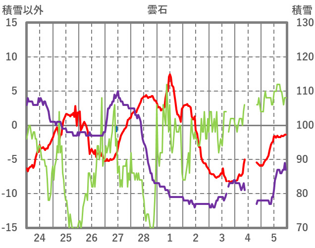 | 日 | 時 | 気温 | 降水 | 風向/風速 | 日照 | 積雪 | 降雪 |