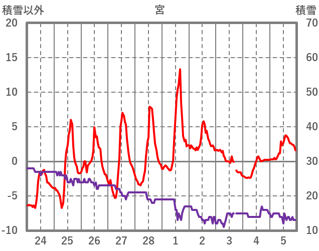 | 日 | 時 | 気温 | 降水 | 風向/風速 | 日照 | 積雪 | 降雪 |