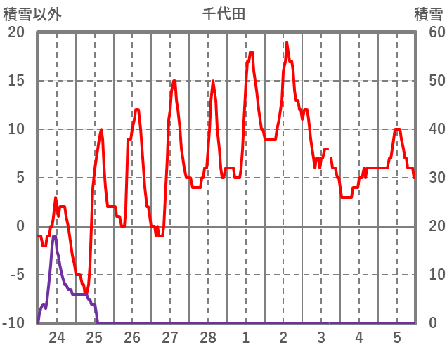 | 日 | 時 | 気温 | 降水 | 風向/風速 | 日照 | 積雪 | 降雪 |