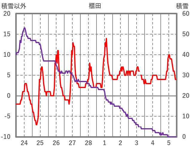 | 日 | 時 | 気温 | 降水 | 風向/風速 | 日照 | 積雪 | 降雪 |