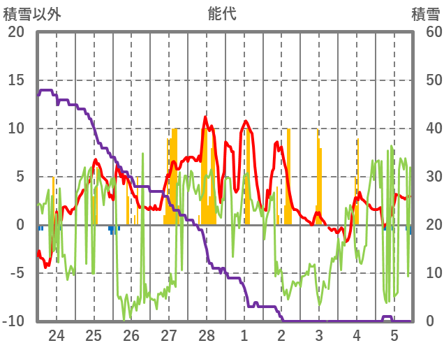 | 日 | 時 | 気温 | 降水 | 風向/風速 | 日照 | 積雪 | 降雪 |